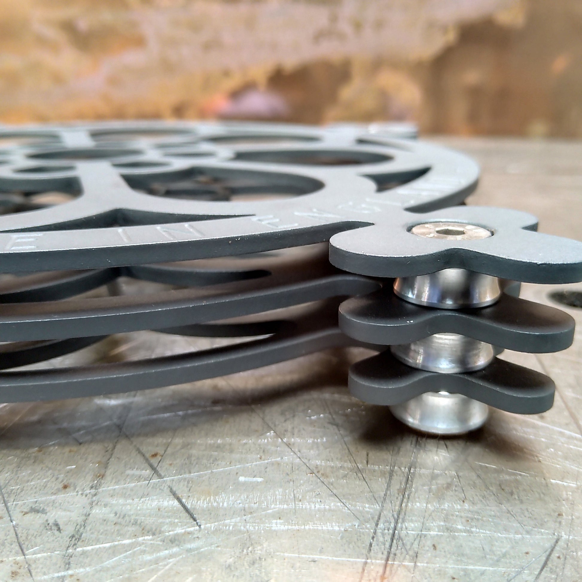 These coasters are my interpretation of the cast iron trivets I was previously selling on here.. The layers represent the draft angle of the original castings., each layer is separated by machined aluminium spacers like the ones seen on my other pieces.. They are held together with brass machine screws and sit on cork feet..
